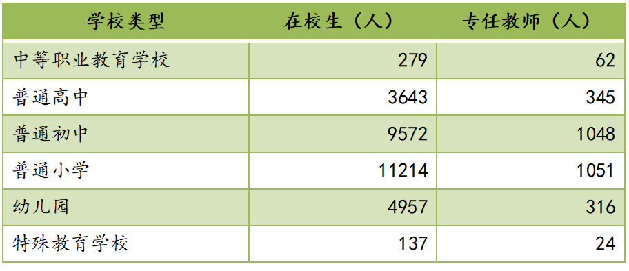 全區(qū)現(xiàn)有中等職業(yè)教育學(xué)校1所,普通高中3所,普通初中18所,普通小學(xué)(含農(nóng)村小學(xué)網(wǎng)點(diǎn))16所,特殊教育學(xué)校1所,幼兒園45所。