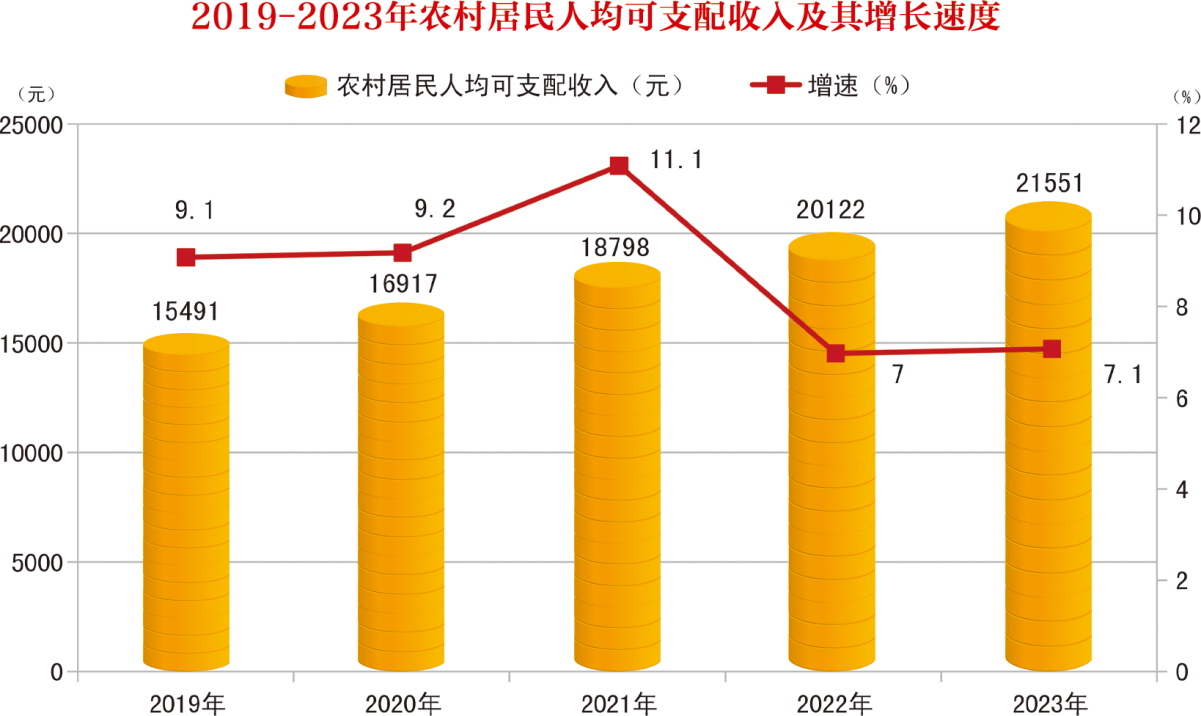 全市農(nóng)村居民人均可支配收入21551元,同比增長7.1%。從收入構(gòu)成看,農(nóng)村居民人均工資性收入10988元,增長6.6%;人均經(jīng)營凈收入9283元,增長8.0%;人均財產(chǎn)凈收入394元,增長3.1%;人均轉(zhuǎn)移凈收入886元,增長5.4%。