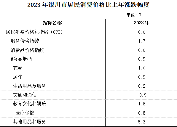 2023年,銀川市居民消費價格指數(shù)(CPI)同比上漲0.6%[3]。從調(diào)查的八大類商品和服務(wù)價格來看,食品煙酒類上漲0.5%,衣著類上漲1.0%,居住類上漲0.5%,生活用品及服務(wù)上漲0.2%,交通和通信類下降0.9%,教育文化和娛樂類上漲1.8%,醫(yī)療保健類上漲0.8%,其他用品和服務(wù)上漲5.3%。