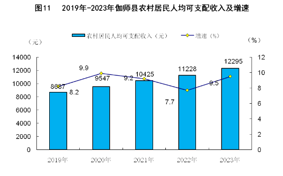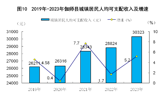 2023年,城鎮(zhèn)居民人均可支配收入30323元,比上年增長5.2%。農(nóng)村居民人均可支配收入12295元,比上年增長9.5%。