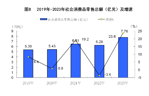 全年社會消費品零售總額7.76億元,比上年增長23.6%。其中,限額以上社會消費品零售總額2.06億元,增長56.2%。按消費類型分,商品零售額1.79億元,同比增長70.4%;餐飲收入0.27億元,增長1.0%。按行業(yè)分,批發(fā)業(yè)銷售額累計完成43.85億元,同比下降1.2%;零售業(yè)銷售額累計完成4.29億元,同比增長16.1%;餐飲業(yè)營業(yè)額累計完成1.07億元,同比增長16.9%;住宿業(yè)營業(yè)額累計完成0.45億元,同比增長32.4%。