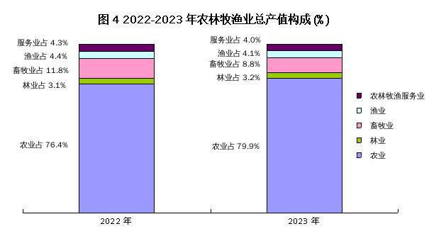 產(chǎn)值:2023年,江南區(qū)本級(jí)實(shí)現(xiàn)農(nóng)林牧漁業(yè)總產(chǎn)值46.07億元,比上年增長3.9%。其中,農(nóng)業(yè)產(chǎn)值36.82億元,比上年增長3.2%;林業(yè)產(chǎn)值1.49億元,比上年增長10.3%;畜牧業(yè)產(chǎn)值4.05億元,比上年增長6.9%;漁業(yè)產(chǎn)值1.88億元,比上年增長4.4%;農(nóng)林牧漁服務(wù)業(yè)產(chǎn)值1.83億元,比上年增長3.9%。農(nóng)林牧漁業(yè)的比重分別為:農(nóng)業(yè)79.9%,比上年提高1.9個(gè)百分點(diǎn);林業(yè)3.2%,比上年提高0.1個(gè)百分點(diǎn);畜牧業(yè)8.8%,比上年下降1.6個(gè)百分點(diǎn);漁業(yè)4.1%,比上年下降0.2個(gè)百分點(diǎn);農(nóng)業(yè)牧漁服務(wù)業(yè)4.0%,與去年持平。(見圖4)