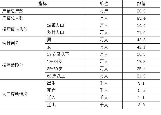 全市戶(hù)籍總?cè)丝?53619人,同比下降0.61%。其中,鄉(xiāng)村人口709956人,同比下降0.53%;城鎮(zhèn)人口143663人,同比下降0.98%。全市人口出生率3.7‰,人口死亡率6.5‰,人口自然增長(zhǎng)率-2.9‰。