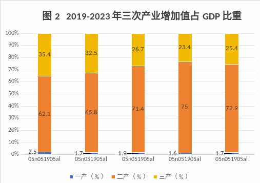 初步核算,全年地區(qū)生產(chǎn)總值364.6億元,按不變價(jià)格計(jì)算,比上年增長(zhǎng)7.2%。其中,第一產(chǎn)業(yè)增加值6.2億元,比上年增長(zhǎng)6.3%;第二產(chǎn)業(yè)增加值265.9億元,比上年增長(zhǎng)7.1%;第三產(chǎn)業(yè)增加值92.6億元,比上年增長(zhǎng)7.5%。三次產(chǎn)業(yè)占比為1.7:72.9:25.4。一產(chǎn)拉動(dòng)GDP增長(zhǎng)0.14個(gè)百分點(diǎn);二產(chǎn)拉動(dòng)GDP增長(zhǎng)4.71個(gè)百分點(diǎn);三產(chǎn)拉動(dòng)GDP增長(zhǎng)2.33個(gè)百分點(diǎn)。三次產(chǎn)業(yè)對(duì)GDP增長(zhǎng)的貢獻(xiàn)率分別為1.99%、65.53%、32.48%。