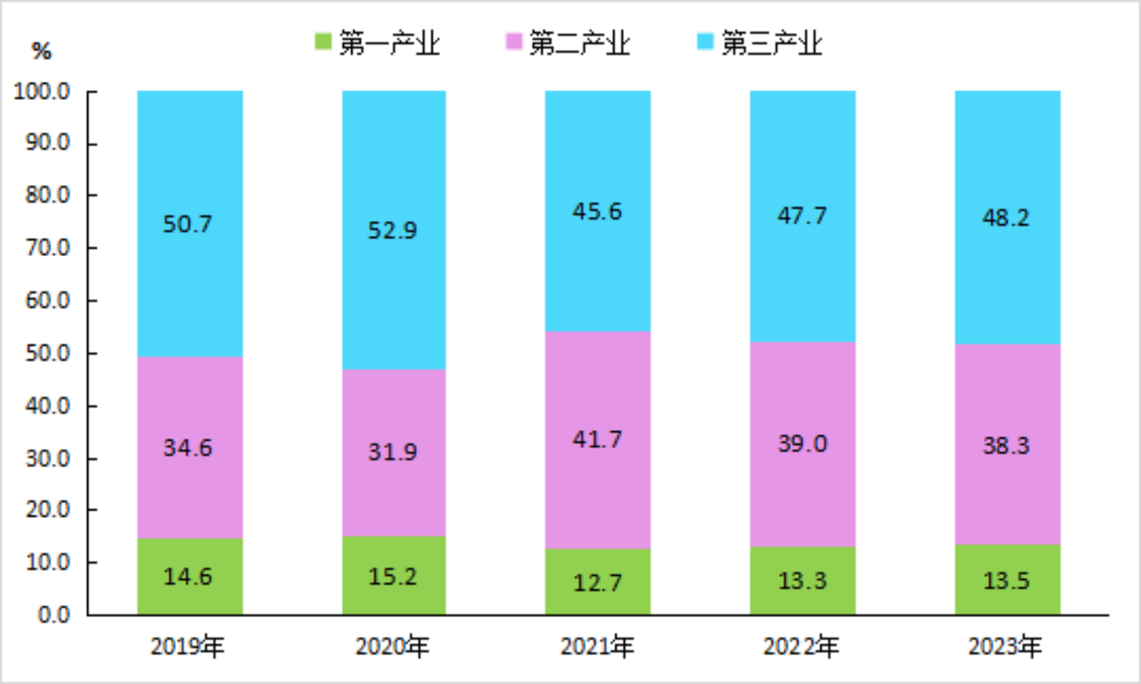 圖2??2019-2023年八步區(qū)三次產(chǎn)業(yè)增加值占GDP比重