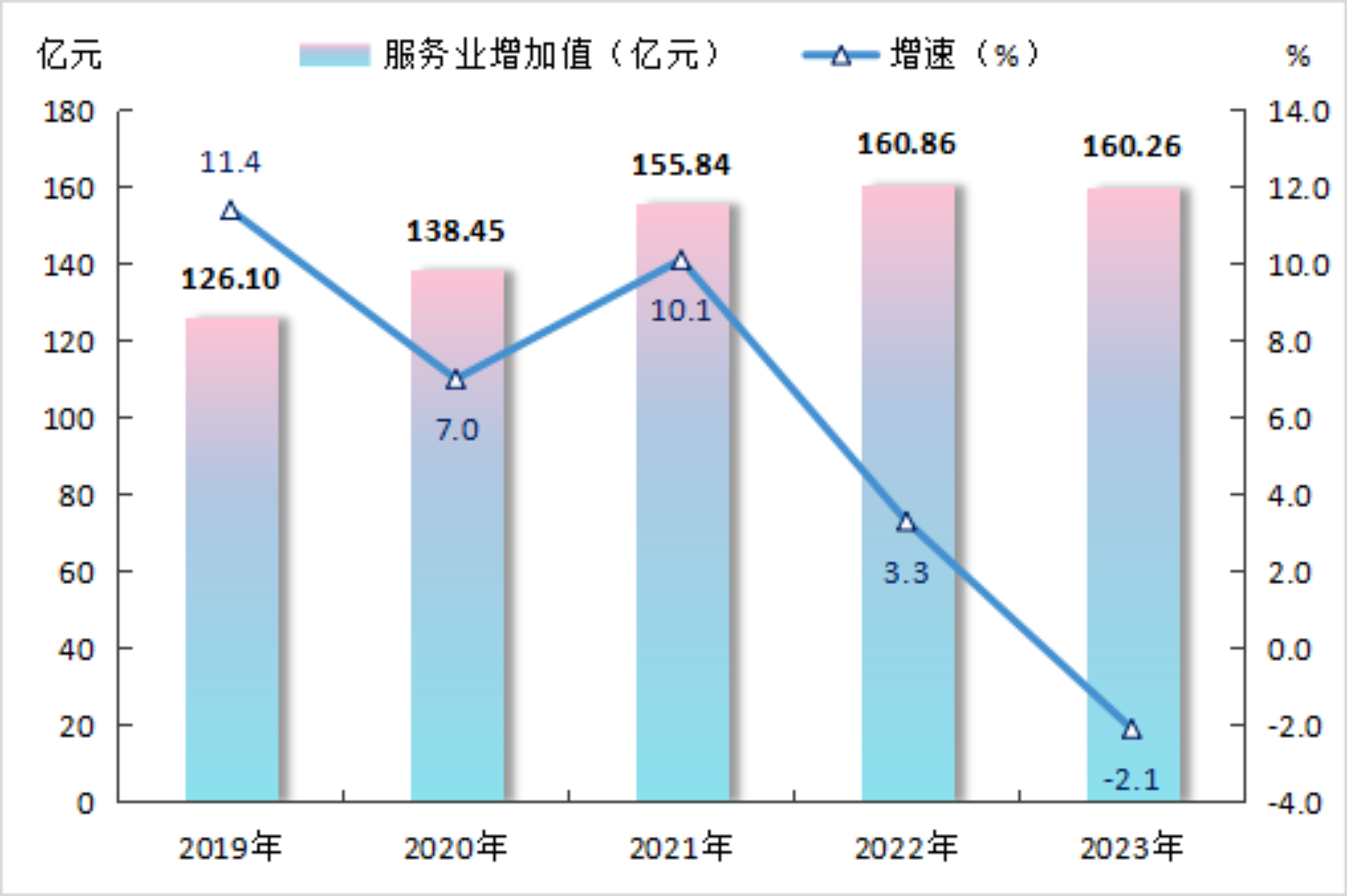 全年批發(fā)和零售業(yè)增加值195825萬(wàn)元,比上年下降33.3%;住宿和餐飲業(yè)增加值26703萬(wàn)元,增長(zhǎng)6.1%;交通運(yùn)輸、倉(cāng)儲(chǔ)和郵政業(yè)增加值101999萬(wàn)元,增長(zhǎng)3.0%;金融業(yè)增加值244336萬(wàn)元,增長(zhǎng)10.5%;房地產(chǎn)業(yè)增加值227135萬(wàn)元,增長(zhǎng)1.1%;其他服務(wù)業(yè)增加值773364萬(wàn)元,增長(zhǎng)4.3%。
