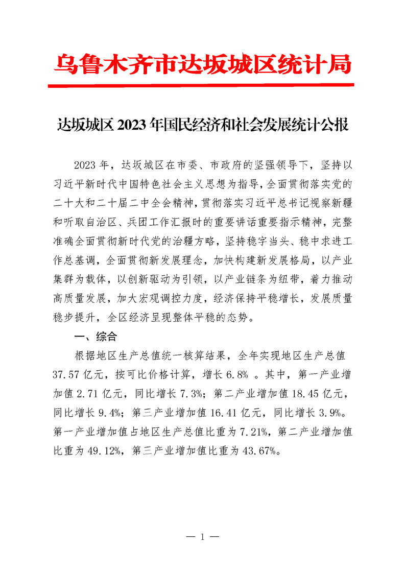 (新疆)2023年烏魯木齊市達(dá)坂城區(qū)國民經(jīng)濟(jì)和社會發(fā)展統(tǒng)計公報