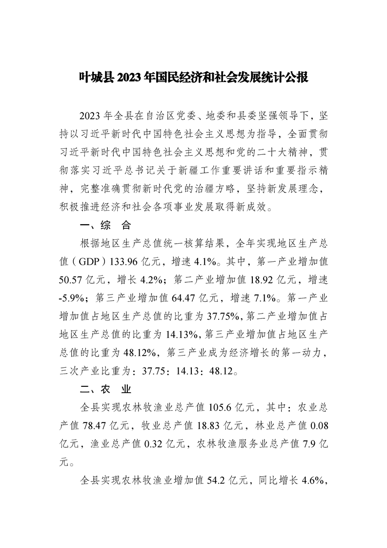 (新疆)2023年喀什地區(qū)葉城縣國民經濟和社會發(fā)展統(tǒng)計公報