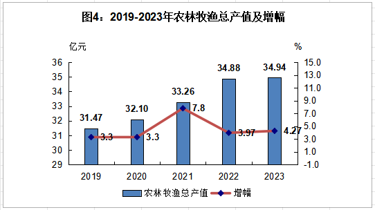 2023年度實現(xiàn)農(nóng)業(yè)總產(chǎn)值34.94億元,可比增長4.27%。其中:其中:農(nóng)業(yè)產(chǎn)值18.15億元,按可比價增速為2.39%;林業(yè)產(chǎn)值1.79元,按可比價增速為10.2%;牧業(yè)產(chǎn)值7.65億元,按可比價增速為5.34%;漁業(yè)產(chǎn)值4.86億元,按可比價增速為5.1%;農(nóng)林牧漁業(yè)輔助性活動產(chǎn)值2.48億元,按可比價增速為8.37%。