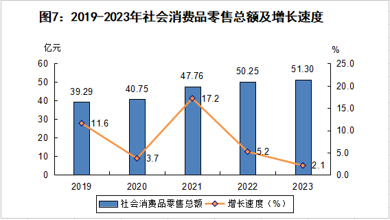 全年實現(xiàn)社會消費品零售總額51.3億元,同比增長2.1%。批發(fā)零售住宿餐飲四大行業(yè)完成營銷額71.42億元,分行業(yè)看,批發(fā)業(yè)實現(xiàn)銷售額17.36億元,同比增長10.1%;零售業(yè)實現(xiàn)銷售額44.4億元,同比增長2.6%;住宿業(yè)實現(xiàn)營業(yè)額0.81億元,同比增長0.1%;餐飲業(yè)實現(xiàn)營業(yè)額8.84億元,同比增長9.6%。