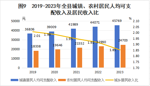 城鎮(zhèn)居民人均可支配收入45769元,同比增長3.9%;農(nóng)村居民人均可支配收24703元,同比增長7.5%;城鄉(xiāng)收入差距比由上年的1.92下降至1.85。