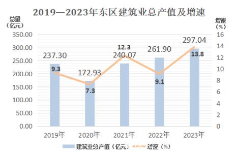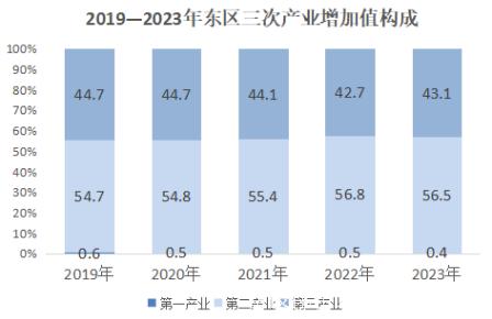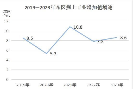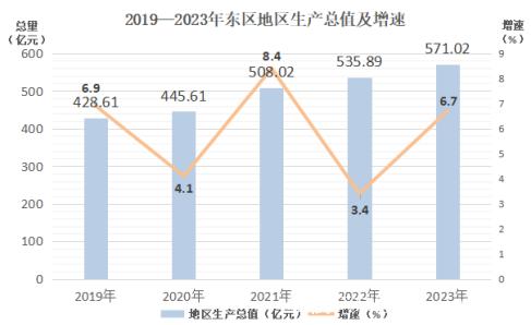 根據(jù)地區(qū)生產(chǎn)總值統(tǒng)一核算初步結(jié)果,2023年東區(qū)實(shí)現(xiàn)地區(qū)生產(chǎn)總值571.02億元,按可比價(jià)計(jì)算,增長6.7%。其中,第一產(chǎn)業(yè)增加值2.46億元,增長3.8%,對經(jīng)濟(jì)增長的貢獻(xiàn)率為0.3%,拉動(dòng)經(jīng)濟(jì)增長0.02個(gè)百分點(diǎn);第二產(chǎn)業(yè)增加值322.64億元,增長7.2%,對經(jīng)濟(jì)增長的貢獻(xiàn)率為58.6%,拉動(dòng)經(jīng)濟(jì)增長3.93個(gè)百分點(diǎn);第三產(chǎn)業(yè)增加值245.93億元,增長6.1%,對經(jīng)濟(jì)增長的貢獻(xiàn)率為41.1%,拉動(dòng)經(jīng)濟(jì)增長2.75個(gè)百分點(diǎn)。三次產(chǎn)業(yè)結(jié)構(gòu)為0.4:56.5:43.1。東區(qū)民營經(jīng)濟(jì)實(shí)現(xiàn)增加值238.22億元,增長4.9%,占地區(qū)生產(chǎn)總值的比重為41.7%。東區(qū)人均地區(qū)生產(chǎn)總值13.83萬元。