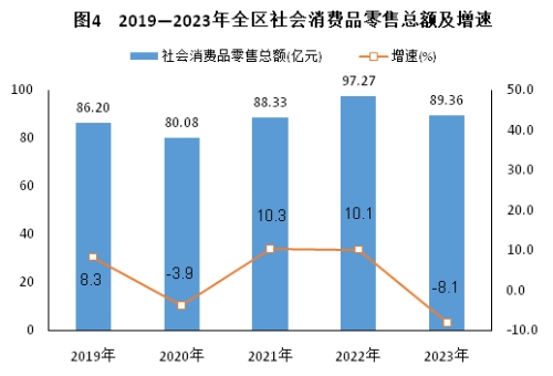 全年社會(huì)消費(fèi)品零售總額89.36億元,同比下降8.1%。其中,限額以上商貿(mào)企業(yè)消費(fèi)品零售額同比下降9.2%。