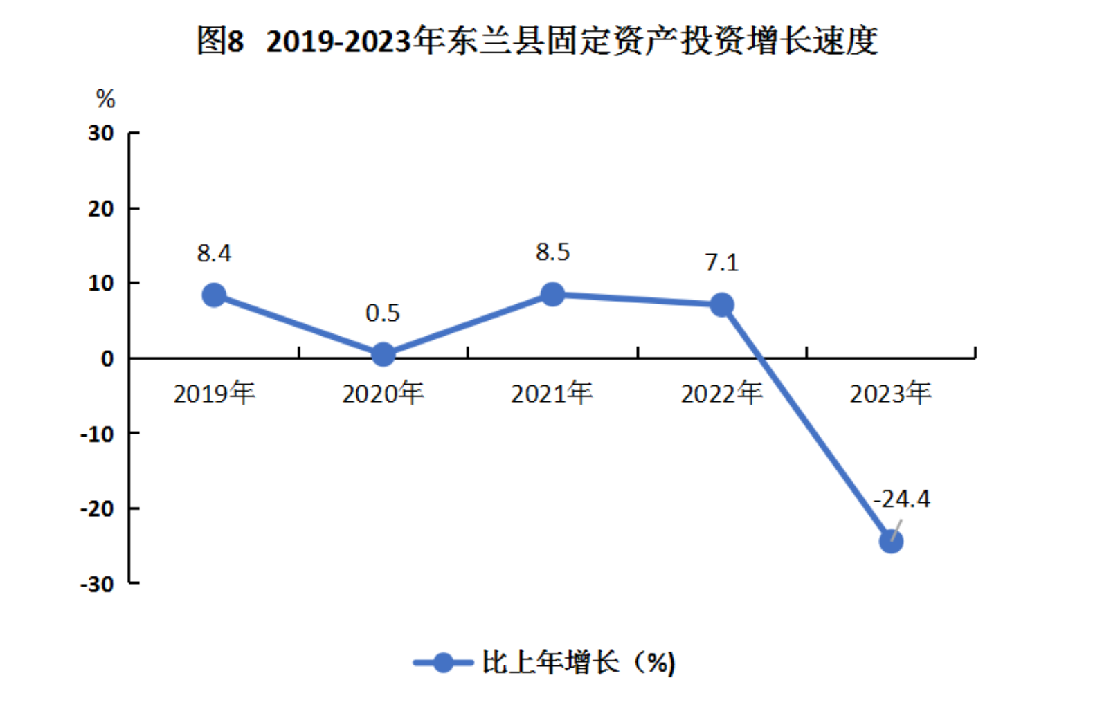 全年全縣固定資產(chǎn)投資(不含農(nóng)戶)比上年下降24.4%。其中,第一產(chǎn)業(yè)投資下降31.1%;第二產(chǎn)業(yè)投資增長57.0%,其中工業(yè)投資增長52.8%;第三產(chǎn)業(yè)投資下降37.0%?;A(chǔ)設(shè)施投資[8]下降19.6%。民間固定資產(chǎn)投資[9]增長6.8%。