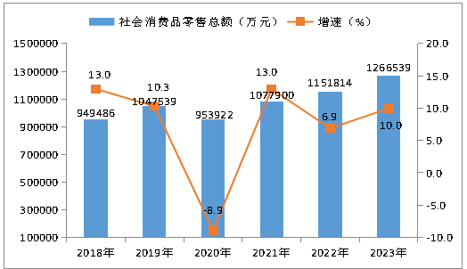圖11 ?2018年—2023年社會(huì)消費(fèi)品零售總額及增速