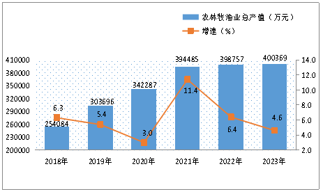 圖5 ?2018年—2023年農(nóng)林牧漁業(yè)總產(chǎn)值及增速