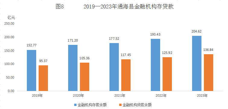 2023年全縣金融業(yè)實現(xiàn)增加值60563萬元,增長3.7%。年末全縣金融機構(gòu)各項存款余額2046231萬元,比上年增加111930萬元,增長5.8%,其中住戶存款余額1778351萬元,比上年增加,125067萬元,增長7.6%。各項貸款余額1368360萬元,比上年增加109149萬元,增長8.7%,存貸比為66.9%,比上年增長1.8個百分點。