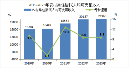 2023年,全縣城鎮(zhèn)常住居民人均可支配收入39809元,同比增長6.1%;農(nóng)村常住居民人均可支配收入21963元,同比增長8.8%。城鎮(zhèn)常住居民人均生活消費支出31440元,同比增長8.2%,其中:食品消費11245元,教育文化娛樂服務(wù)消費4288元;農(nóng)村常住居民人均生活消費支出18222元,同比增長13.2%,其中:食品消費6536元,教育文化娛樂服務(wù)消費2285元。