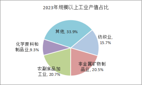 2023年,全縣在庫規(guī)模以上工業(yè)企業(yè)172家。規(guī)模以上工業(yè)增加值同比增長9.1%。全年完成規(guī)模以上工業(yè)總產(chǎn)值205.79億元,同比增長7.5%,其中輕工業(yè)產(chǎn)值97.20億元,同比增長0.3%;重工業(yè)產(chǎn)值108.59億元,同比增長14.8%;分行業(yè)看,紡織業(yè)產(chǎn)值32.31億元,同比下降4%,非金屬礦物制品業(yè)產(chǎn)值42.11億元,同比下降16%,農(nóng)副食品加工業(yè)產(chǎn)值42.55億元,同比增長2.9%,化學原料和化學制品制造業(yè)產(chǎn)值19.15億元,同比增長18.0%。其他產(chǎn)值69.68億元,同比增長39%。