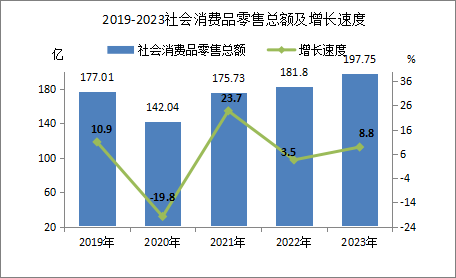 2023年,全年實現(xiàn)社會消費品零售總額197.75億元,比上年增長8.8%。分地區(qū)看,城鎮(zhèn)消費品零售額145.99億元,比上年增長9.4%;農(nóng)村消費品零售額51.76億元,比上年增長6.9%。分行業(yè)看,批發(fā)零售業(yè)零售額153.46億元,比上年增長8.5 %;住宿餐飲業(yè)零售額44.29億元,比上年增長9.8%。