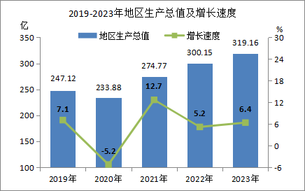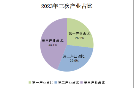 初步核算,全年地區(qū)生產(chǎn)總值(GDP)319.16億元,按可比價格計算,同比增長6.4%。其中,第一產(chǎn)業(yè)增加值完成85.77億元,同比增長4.3%;第二產(chǎn)業(yè)增加值完成92.55億元,同比增長5.9%;第三產(chǎn)業(yè)增加值完成140.83億元,同比增長7.9%。第三產(chǎn)業(yè)中,批發(fā)和零售業(yè)、交通運輸倉儲和郵政業(yè)、住宿和餐飲業(yè)、金融業(yè)、房地產(chǎn)業(yè)、其他服務(wù)業(yè)增加值同比增長18.2%、17.8%、9.3%、14.1%、1.4%、6.5%。三次產(chǎn)業(yè)結(jié)構(gòu)由2022年25.8:32.0:42.2調(diào)整為2023年26.9:29.0:44.1。人均地區(qū)生產(chǎn)總值達到41698元。城鎮(zhèn)建設(shè)穩(wěn)步推進,城鎮(zhèn)化率49.97%。