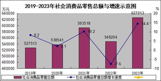 全年全市完成社會消費品零售總額627013萬元,同比增長14.4%。按經(jīng)營地統(tǒng)計,城鎮(zhèn)消費品零售額597025萬元、同比增長13.6%,鄉(xiāng)村消費品零售額29988萬元、同比增長32.3%;按消費類型統(tǒng)計,商品零售額510619萬元、同比增長12.2%,餐飲收入額116394萬元、同比增長25.2%。