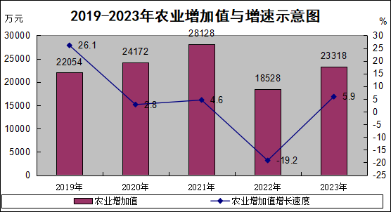 全年完成農(nóng)業(yè)總產(chǎn)值46202萬元,同比增長6.3%。實現(xiàn)農(nóng)業(yè)增加值23318萬元,同比增長5.9%。糧食總產(chǎn)量7507噸、增長137.9%。其中,夏糧產(chǎn)量55.8噸、下降20.9%,秋糧產(chǎn)量7453噸、增長143.3%。小麥產(chǎn)量54.4噸、下降21.9%,玉米產(chǎn)量7384噸、增長143.3%,馬鈴薯產(chǎn)量68噸、增長31.8%。食用菌產(chǎn)量348噸、增長25.9%,油料產(chǎn)量592噸、下降58.2%。