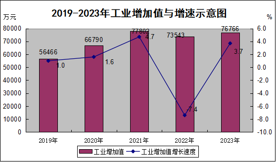 全年全市全部工業(yè)增加值76766萬元、同比增長3.7%。規(guī)模以上工業(yè)增加值同比下降1.7%,分經(jīng)濟類型看,國有及國有控股企業(yè)增加值增長5.2%,股份制企業(yè)下降22.5%,私營企業(yè)下降21.8%。分門類看,制造業(yè)下降18.5%,電力、熱力、燃氣及水生產(chǎn)和供應(yīng)業(yè)增長3.2%。