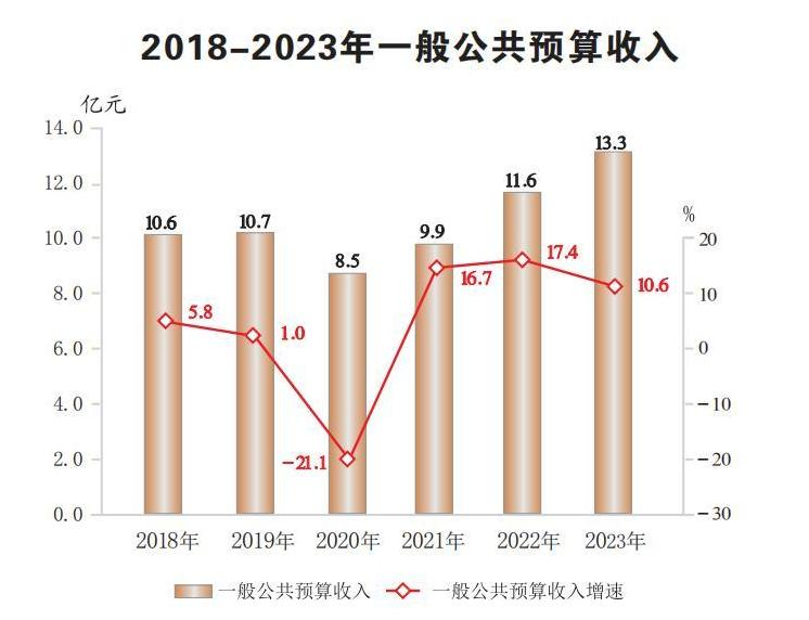 財政?全年財政總收入57.7億元,比上年增長23.5%,其中:一般公共預算收入13.3億元,增長14.4%。財政總支出116.3億元,增長6.6%;一般公共預算支出66.3億元,增長4.5%。