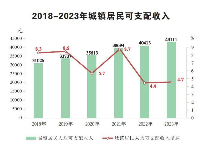 按常住地分,全年城鎮(zhèn)居民人均可支配收入43111元,比上年增長4.7%。城鎮(zhèn)居民人均消費支出23977元,城鎮(zhèn)居民恩格爾系數(shù)19.3%。農(nóng)村居民人均可支配收入20019元,增長7.2%,農(nóng)村居民人均消費支出14921元,農(nóng)村居民恩格爾系數(shù)27.6%。
