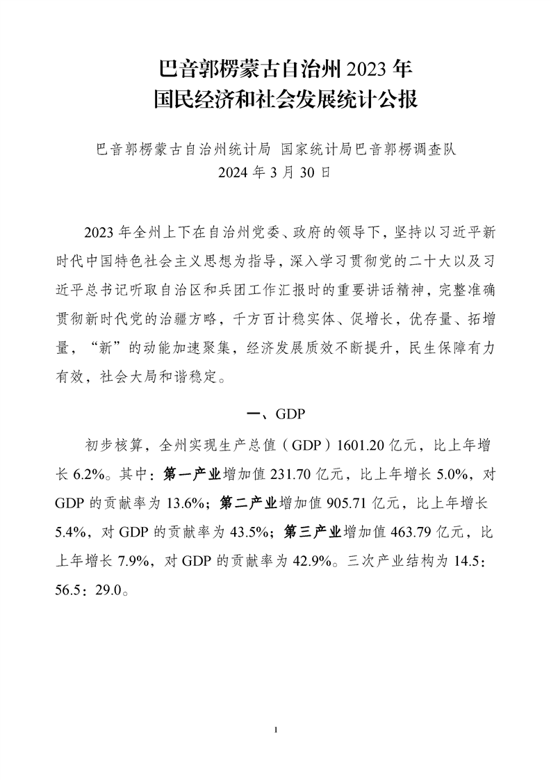 (新疆)2023年巴音郭楞蒙古自治州國(guó)民經(jīng)濟(jì)和社會(huì)發(fā)展統(tǒng)計(jì)公報(bào)
