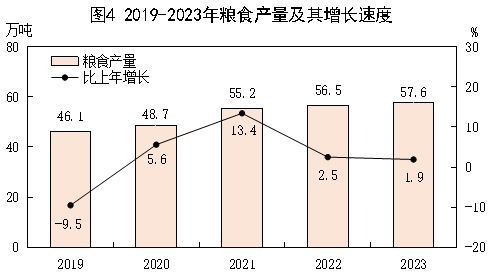全年糧食產(chǎn)量57.6萬噸,比上年增產(chǎn)1.9%,其中,夏糧產(chǎn)量16.3萬噸,增產(chǎn)4%;秋糧產(chǎn)量41.3萬噸,增產(chǎn)1.1%。棉花產(chǎn)量3.2萬噸,增產(chǎn)3.7%。油料產(chǎn)量1.5萬噸,增產(chǎn)9.2%。蔬菜產(chǎn)量191.3萬噸,增產(chǎn)5%。水果產(chǎn)量28.9萬噸,增產(chǎn)2.4%。藥材產(chǎn)量10.9萬噸,增產(chǎn)4.2%。