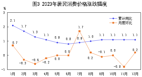 全年居民消費(fèi)價(jià)格比上年上漲1.1%。其中,食品煙酒類價(jià)格上漲1.3%,衣著類價(jià)格上漲1.6%,居住類價(jià)格下降0.1%,生活用品及服務(wù)類價(jià)格同比持平,交通和通信類價(jià)格下降2.4%,教育文化和娛樂類價(jià)格上漲0.3%,醫(yī)療保健類價(jià)格上漲6.9%,其他用品和服務(wù)類價(jià)格上漲3.3%。