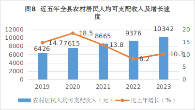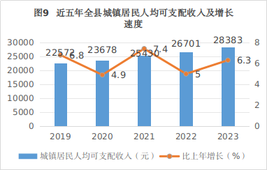 全年全縣居民人均可支配收入16771元,增長8.5%。其中,農(nóng)村居民人均可支配收入10342元,增長10.3%;城鎮(zhèn)居民人均可支配收入28383元,增長6.3%。