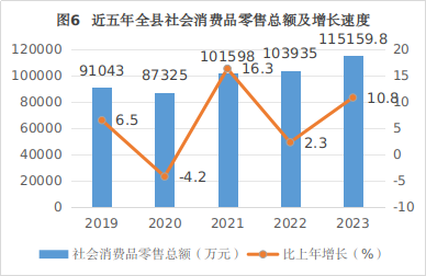 全年社會消費品零售總額115159.8萬元,比上年增長10.8%。其中,城鎮(zhèn)市場消費品零售額82454.4萬元,增長11%;鄉(xiāng)村消費品零售額32705.4萬元,增長10.3%。從消費形態(tài)看,商品零售額96308.1萬元,增長10.7%;餐飲收入18851.7萬元,增長11.3%。