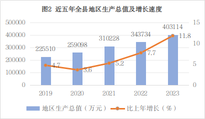 初步核算,全年全縣地區(qū)生產(chǎn)總值403114萬元,同比增長11.8%。其中,第一產(chǎn)業(yè)增加值135882萬元,同比增長7.1%;第二產(chǎn)業(yè)增加值163628萬元,同比增長21.6%;第三產(chǎn)業(yè)增加值103604萬元,同比增長8.5%。三次產(chǎn)業(yè)結構為33.7:40.6:25.7。