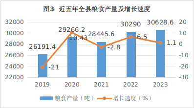 全年糧食產(chǎn)量30628.6噸,比上年增加1.1%。其中,夏糧產(chǎn)量36.1噸,增長106.3%;秋糧產(chǎn)量30592.5噸,增加1.1%。