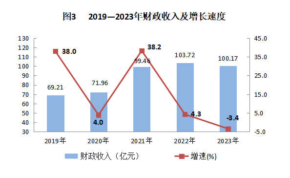 財(cái)政:2023年財(cái)政收入1001673萬元,同比下降3.4%(見圖3);一般公共預(yù)算收入208394萬元,同比下降0.1%;一般公共預(yù)算支出328285萬元,同比下降6.7%。