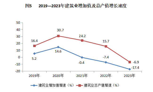 建筑業(yè):2023年,城區(qū)建筑業(yè)總產(chǎn)值559.52億元,同比下降6.9%;建筑業(yè)增加值62.68億元,同比下降17.4%(見圖5)。