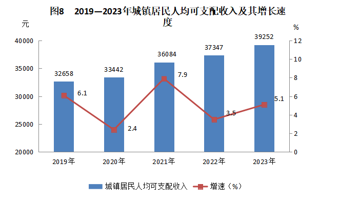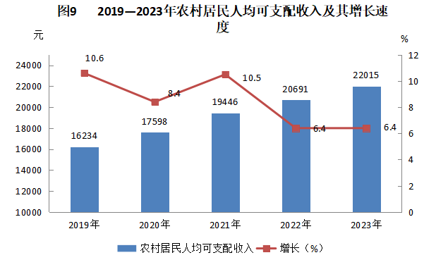 城鄉(xiāng)居民生活:2023年城區(qū)全體居民人均可支配收入34677元,同比增長(zhǎng)5.6%,其中城鎮(zhèn)居民人均可支配收入39252元,同比增長(zhǎng)5.1% (見圖8);農(nóng)村居民人均可支配收入22015元,同比增長(zhǎng)6.4%(見圖9)。全年城區(qū)全體居民人均消費(fèi)性支出17278元,同比增長(zhǎng)10.1%,其中城鎮(zhèn)居民人均消費(fèi)性支出19102元,同比增長(zhǎng)10.4%;農(nóng)村居民人均消費(fèi)性支出12231元,同比增長(zhǎng)7.5%(見表4)。