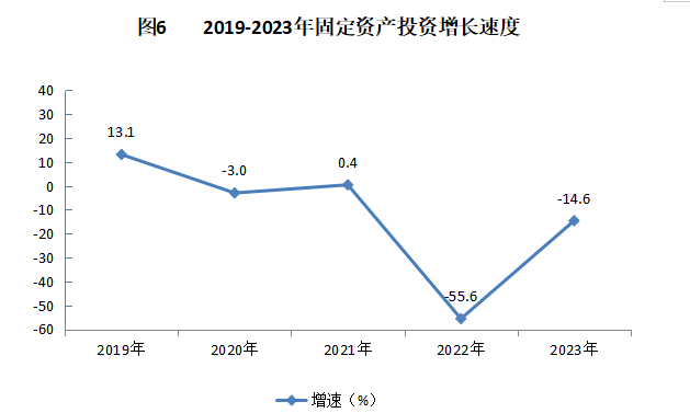 固定資產(chǎn)投資:2023年城區(qū)固定資產(chǎn)投資同比下降14.6%(見圖6)。其中,項(xiàng)目投資下降17.1%;房地產(chǎn)開發(fā)投資同比下降13.4%。從三次產(chǎn)業(yè)看,第一產(chǎn)業(yè)投資同比下降80.5%;第二產(chǎn)業(yè)投資同比下降26.9%,其中,工業(yè)投資同比下降22.2%;第三產(chǎn)業(yè)投資同比下降12.8%。在固定資產(chǎn)投資中,民間投資同比下降18.6%,占固定資產(chǎn)投資的比重為37.87%。