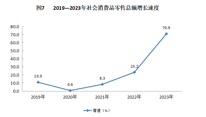 消費(fèi)品市場(chǎng)。全年社會(huì)消費(fèi)品零售總額1634454.2萬元,同比增長(zhǎng)70.9%(見圖7)。其中,城鎮(zhèn)消費(fèi)品零售額1534853.3萬元,同比增長(zhǎng)72.3%;鄉(xiāng)村消費(fèi)品零售額99600.9萬元,同比增長(zhǎng)52.0%。在限額以上商品零售額中,糧油、食品類零售額同比增長(zhǎng)46.6%;飲料類零售額同比下降33.9%;服裝、鞋帽、針紡織品類零售額同比下降63.2%;日用品類零售額同比下降43.4%;文化辦公用品類零售額同比下降11.3%;石油及制品類零售額同比增長(zhǎng)14.5%;汽車類零售額同比增長(zhǎng)178.4%。