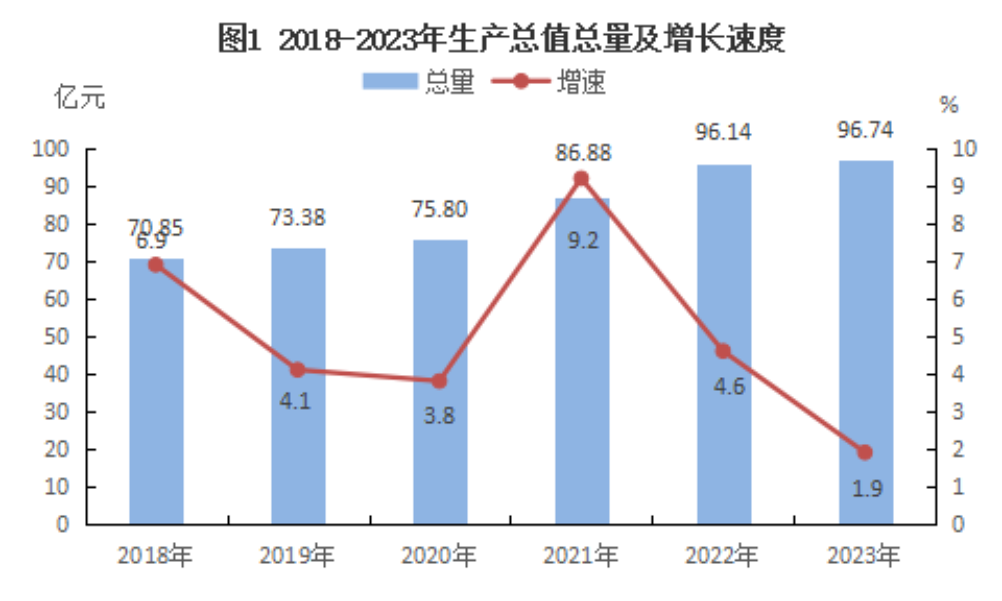 初步核算,全年全縣實(shí)現(xiàn)生產(chǎn)總值96.74億元,按可比價(jià)計(jì)算,比上年增長(zhǎng)1.9%。從產(chǎn)業(yè)看,第一產(chǎn)業(yè)增加值34.91億元,增長(zhǎng)4.6%;第二產(chǎn)業(yè)增加值27.67億元,下降0.9%;第三產(chǎn)業(yè)增加值34.16億元,增長(zhǎng)1.2%。第一產(chǎn)業(yè)增加值占地區(qū)生產(chǎn)總值比重為36.1%,第二產(chǎn)業(yè)增加值比重為28.6%,第三產(chǎn)業(yè)增加值比重為35.3%。按常住人口計(jì)算,全年人均地區(qū)生產(chǎn)總值49319元,比上年增長(zhǎng)2.0%[2]。