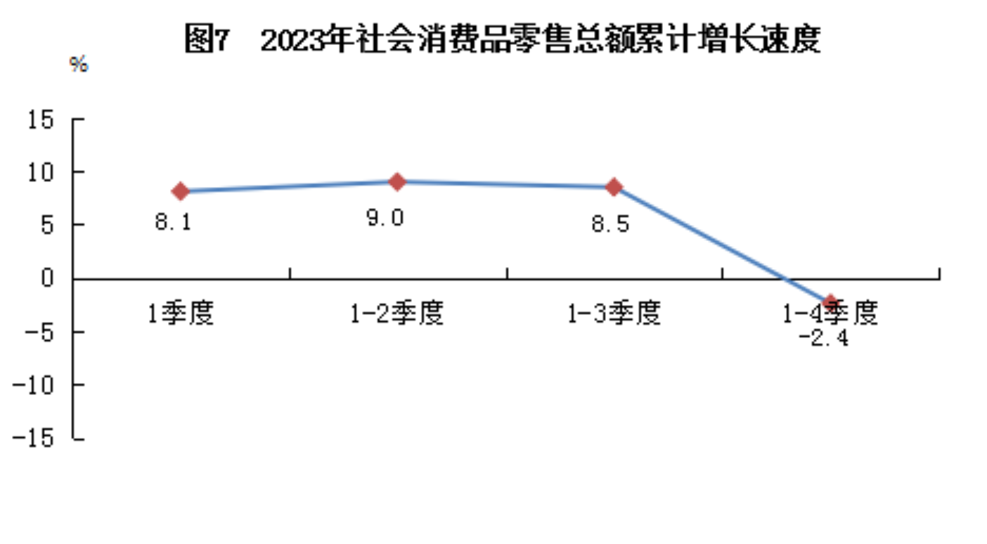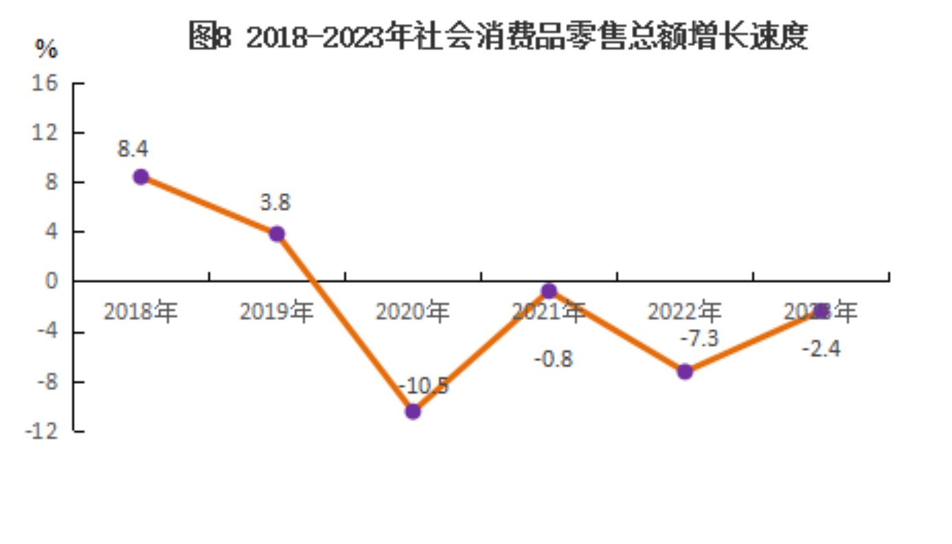 全年實(shí)現(xiàn)社會(huì)消費(fèi)品零售總額比上年下降2.4%。按經(jīng)營(yíng)地統(tǒng)計(jì),城鎮(zhèn)消費(fèi)品零售額下降1.0%;鄉(xiāng)村消費(fèi)品零售額下降5.6%。