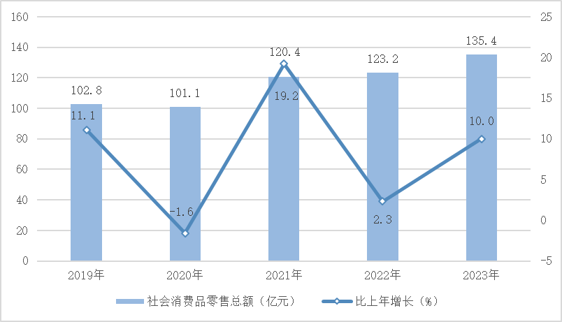 全年實現(xiàn)社會消費品零售總額135.4億元,比上年增長10.0%。其中,限額以上企業(yè)(單位)消費品零售總額19.5億元,下降26.3%。在限額以上企業(yè)(單位)中,通過互聯(lián)網(wǎng)實現(xiàn)的商品零售額2580.3萬元,比上年下降22.7%。
