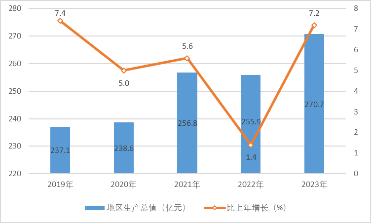 根據(jù)地區(qū)生產(chǎn)總值統(tǒng)一核算初步結(jié)果,2023年儀隴縣實現(xiàn)地區(qū)生產(chǎn)總值270.7億元,按可比價計算,比上年增長7.2%。其中,第一產(chǎn)業(yè)增加值68.3億元,增長4.4%;第二產(chǎn)業(yè)增加值88.2億元,增長9.9%;第三產(chǎn)業(yè)增加值114.2億元,增長7.0%,三次產(chǎn)業(yè)對經(jīng)濟增長的貢獻率分別為18.1%、42.7%、39.2%。三次產(chǎn)業(yè)結(jié)構(gòu)為25.2:32.6:42.2。
