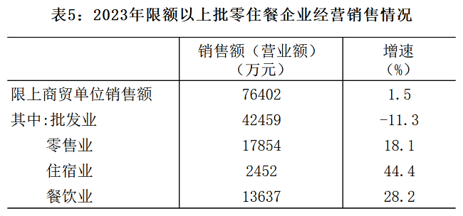 分行業(yè)來看,限上批發(fā)企業(yè)累計(jì)實(shí)現(xiàn)銷售額42459萬元,同比下降11.3%;限上零售企業(yè)累計(jì)實(shí)現(xiàn)銷售額17854萬元,同比增長18.1%;限上住宿企業(yè)累計(jì)實(shí)現(xiàn)營業(yè)額2452萬元,同比增長44.4%;限上餐飲企業(yè)累計(jì)實(shí)現(xiàn)營業(yè)額13637萬元,同比增長28.2%。