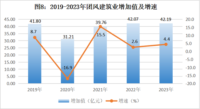 全縣92家資質(zhì)等級以上的建筑企業(yè)累計(jì)完成總產(chǎn)值93.10億元,同比下降70.8%。建筑業(yè)實(shí)現(xiàn)增加值42.19億元,同比增長4.4%;建筑業(yè)增加值占地區(qū)生產(chǎn)總值的比重為29.5%,占第二產(chǎn)業(yè)的比重為63.2%。
