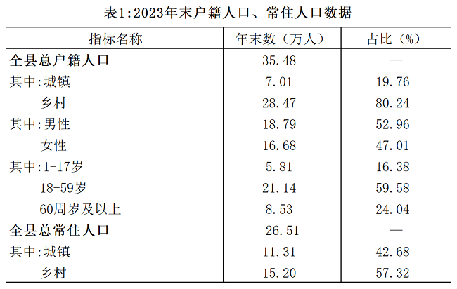 年末全縣常住人口26.51萬人,其中,城鎮(zhèn)11.31萬人,農(nóng)村15.20萬人。常住人口城鎮(zhèn)化率達(dá)到42.68%,比上年增加1.03個(gè)百分點(diǎn)。