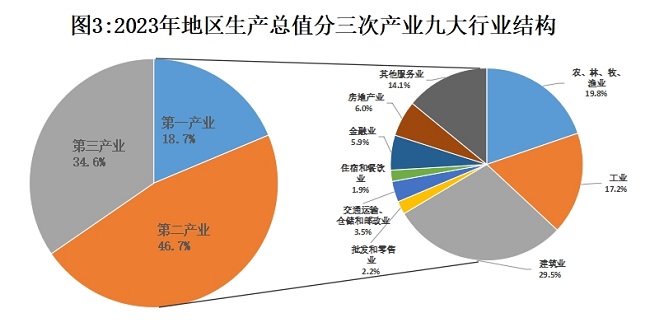 經(jīng)初步核算,2023年全縣實(shí)現(xiàn)生產(chǎn)總值(GDP)142.93億元(現(xiàn)價(jià)),按可比價(jià)格計(jì)算,增長5.5%。其中:第一產(chǎn)業(yè)增加值26.72億元,增長4.4%;第二產(chǎn)業(yè)增加值66.75億元,增長4.8%;第二產(chǎn)業(yè)中,全部工業(yè)增加值24.56億元,增長5.4%;第三產(chǎn)業(yè)增加值49.46億元,增長6.8%。第三產(chǎn)業(yè)中,批發(fā)和零售業(yè)、交通運(yùn)輸倉儲和郵政業(yè)、住宿和餐飲業(yè)、金融業(yè)、房地產(chǎn)業(yè)、其他服務(wù)業(yè)增加值分別增長8.2%、14.9%、8.7%、8.1%、1.2%、6.8%。三次產(chǎn)業(yè)結(jié)構(gòu)由2022年的17.6:48.8:33.6調(diào)整為18.7:46.7:34.6。